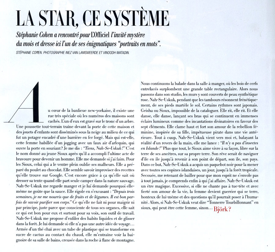 L’officiel, 1er mai 2007Stéphanie Cohen nous fait découvrir l’univers tourbillonnant et délirant de Björk